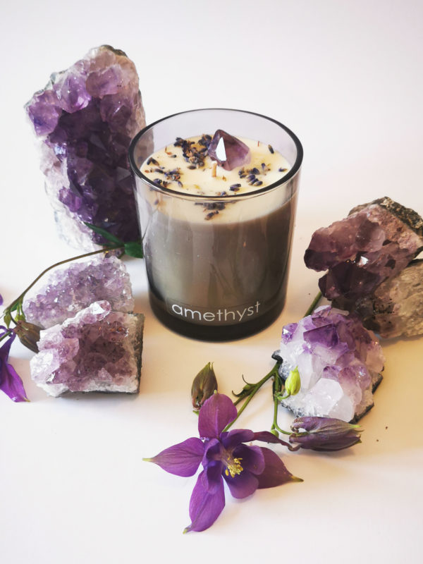 Amethyst – ein frischer, klärender Duft der dich in der Meditation oder bei Aufgaben die deinen Fokus benötigen unterstützt. Die Kerze kommt mit einer Amethyst Drusenspitze und Lavendelblüten.
